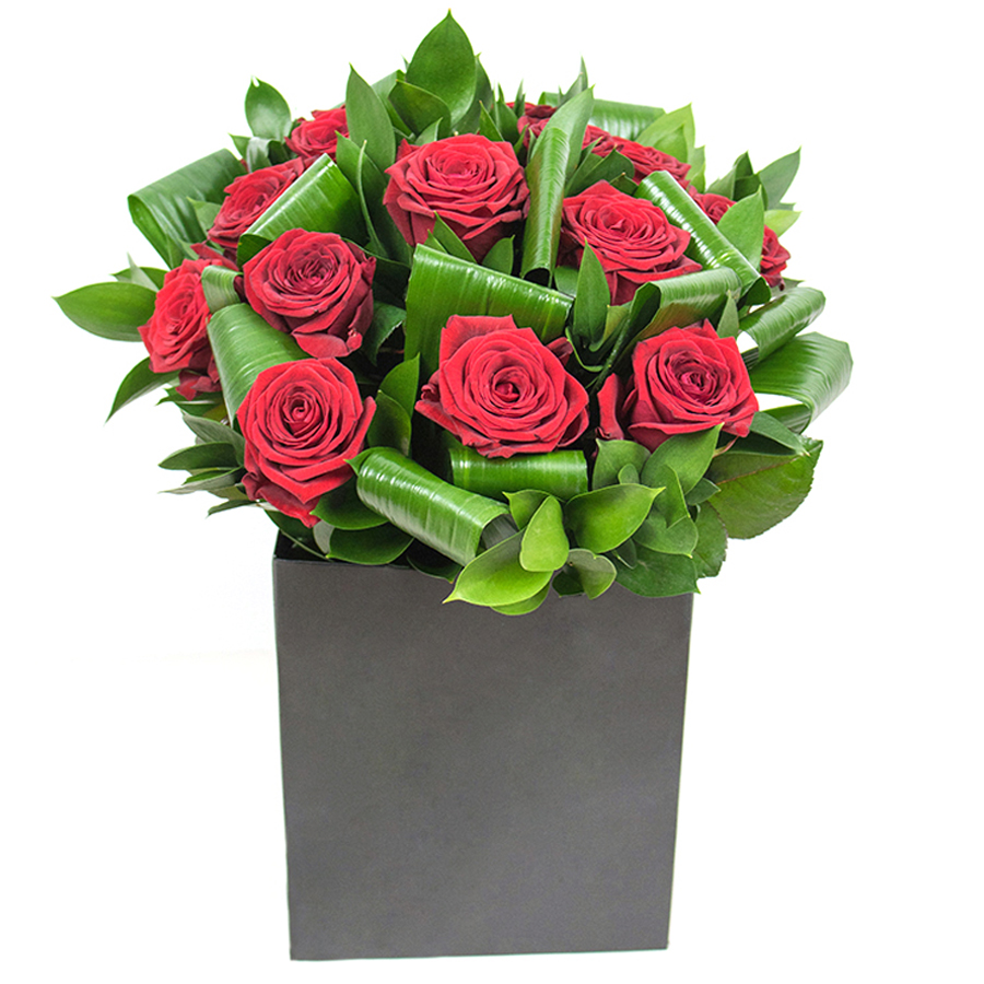 Experience the splendor of our stunning bouquet, featuring deep red roses, vibrant aspidistra leaves, and delicate ruscus. This unique combination brings a touch of elegance and grace to any room.